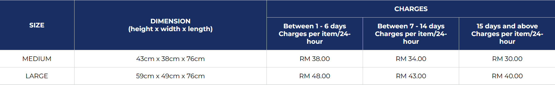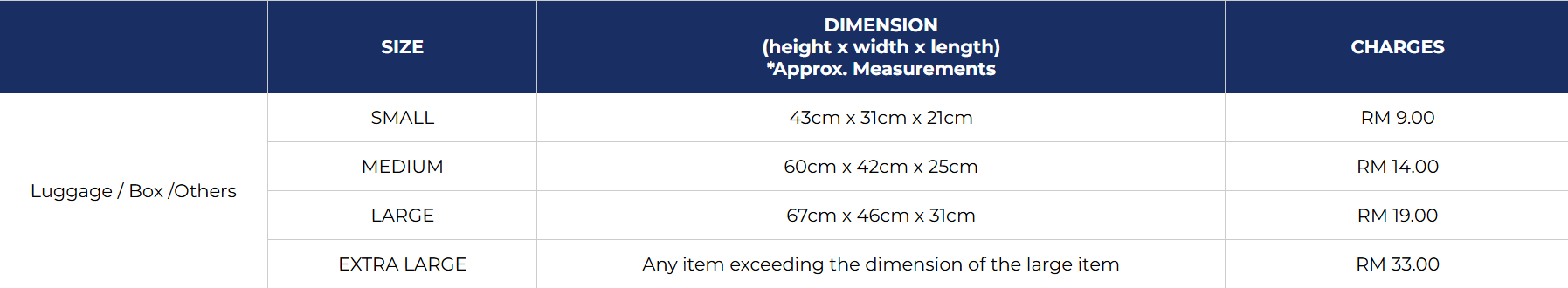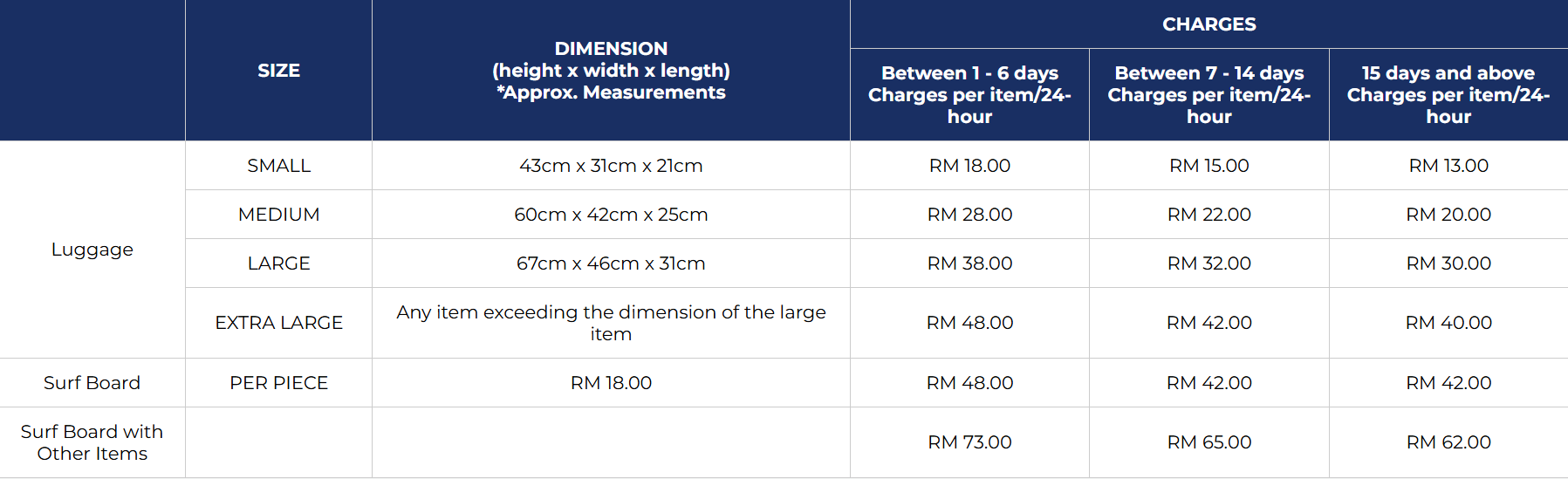 | Luggage | SMALL | 43cm x 31cm x 21cm | RM 18.00 | RM 15.00 | RM 13.00 |